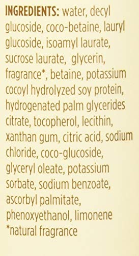 Ingredients: Water, decyl glucoside,coco-betaine, lauryl glucoside, sucroselaurate, glycerin, fragrance (natural fragrance), betaine,sodium cocoyl hydrolyzed soy protein,coco-glucoside, xanthan gum, glucose,glyceryl oleate, sodium chloride, citric acid,potassium iodide, potassium thiocyanate,tocopherol, glucose oxidase, lactoperoxidase,hydrogenated palm glycerides citrate,lecithin, ascorbyl palmitate, limonene.
